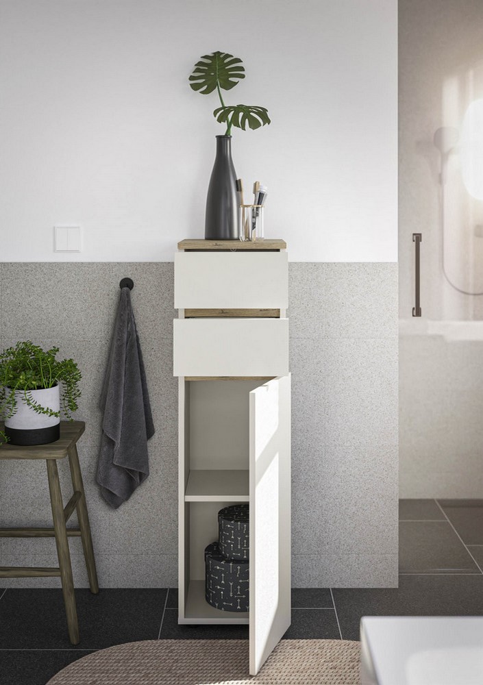 - Ausführung: Front Kaschmir/Abs.Evoke Eiche NB Oberboden Evoke Eiche Nachbildung, 1 Tür, 1 Einlegeboden, 2 Schubkästen, BHT ca. 30 x 108 x 30 cm