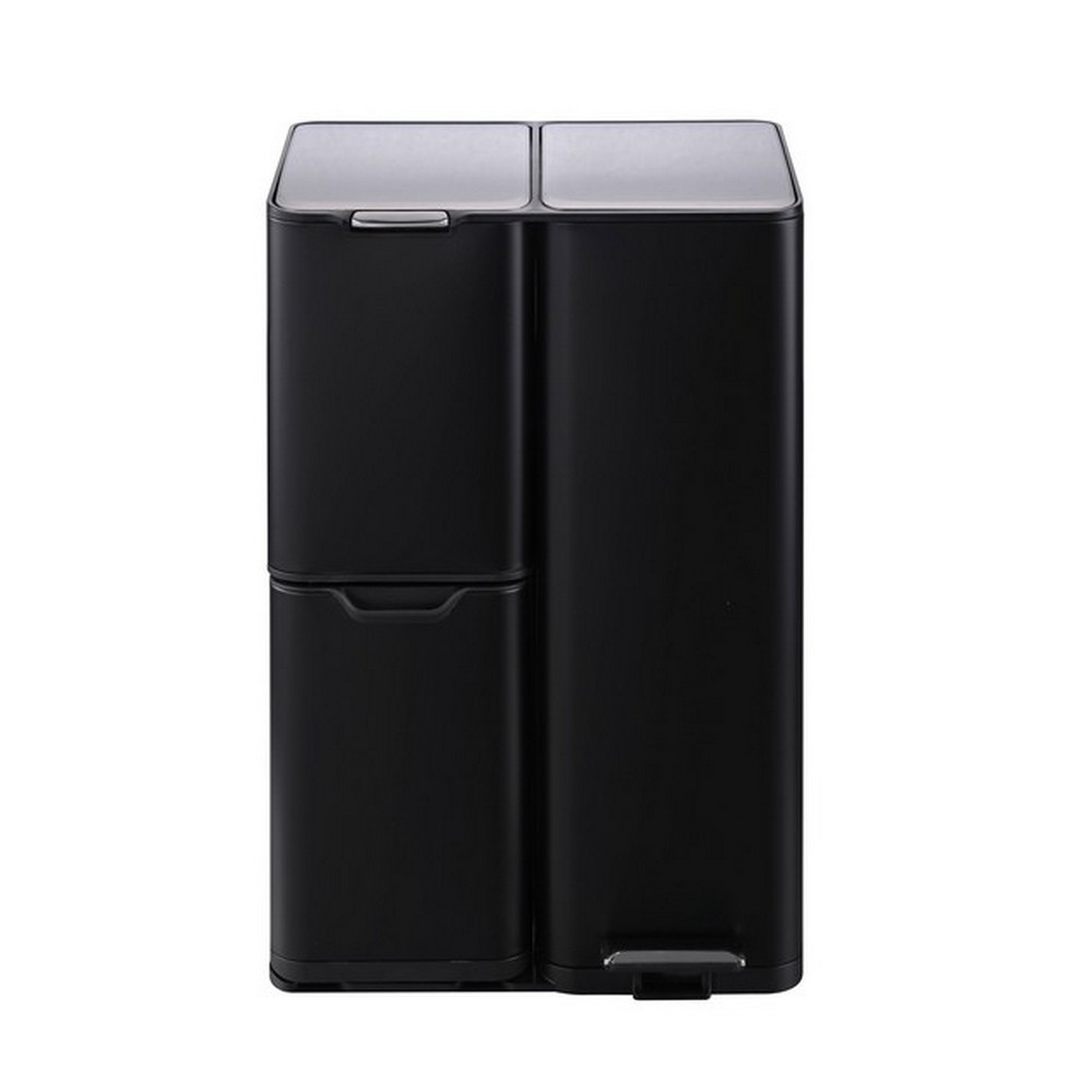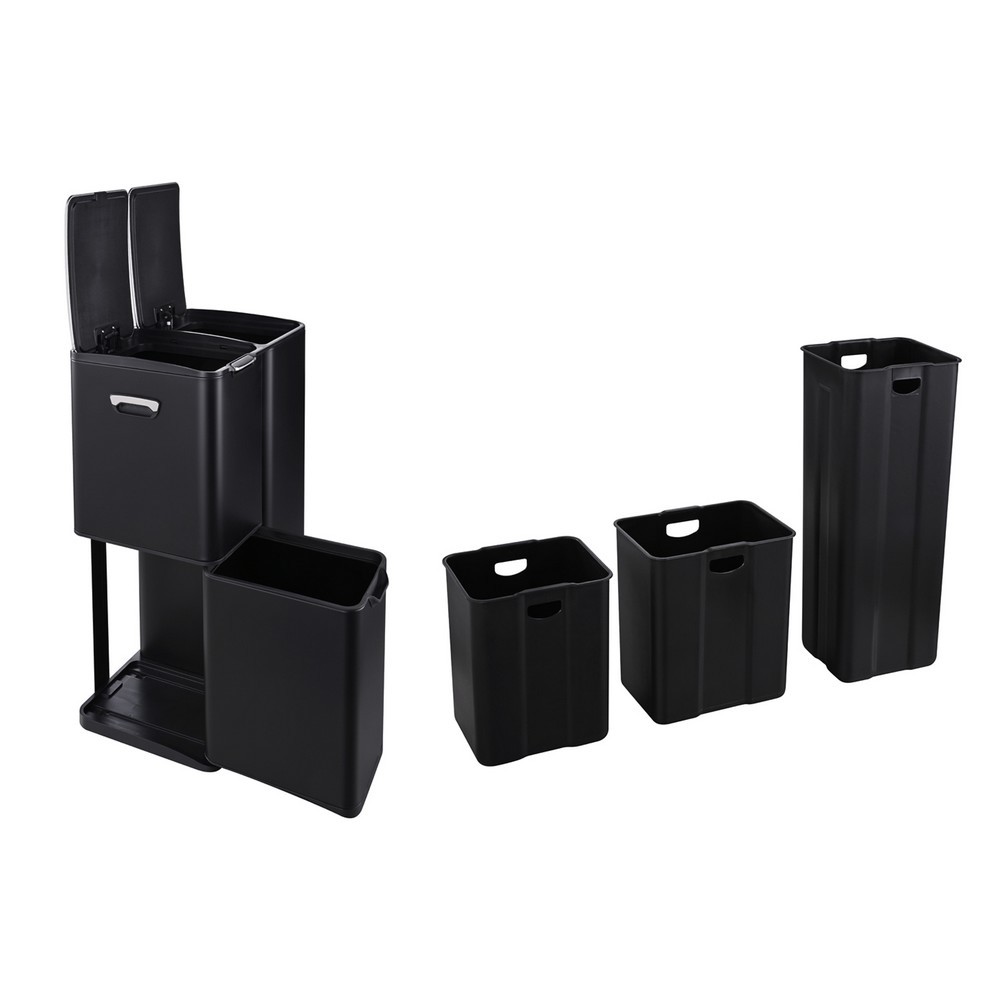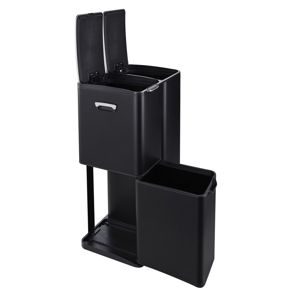 Dank des praktischen Trittmechanismus lässt sich der große 30-Liter-Eimer mühelos per Fuß öffnen. Der obere kleine Eimer (13 Liter) verfügt über einen Knopfdruck-Deckel, während der untere 17-Liter-Eimer als Schublade herausziehbar ist. Alle drei Inneneimer aus Kunststoff sind herausnehmbar, sodass sie besonders einfach zu Entleeren und Reinigen sind.