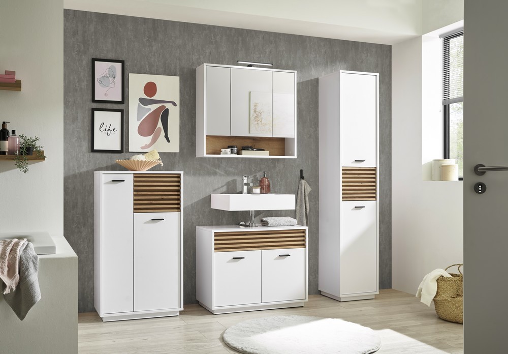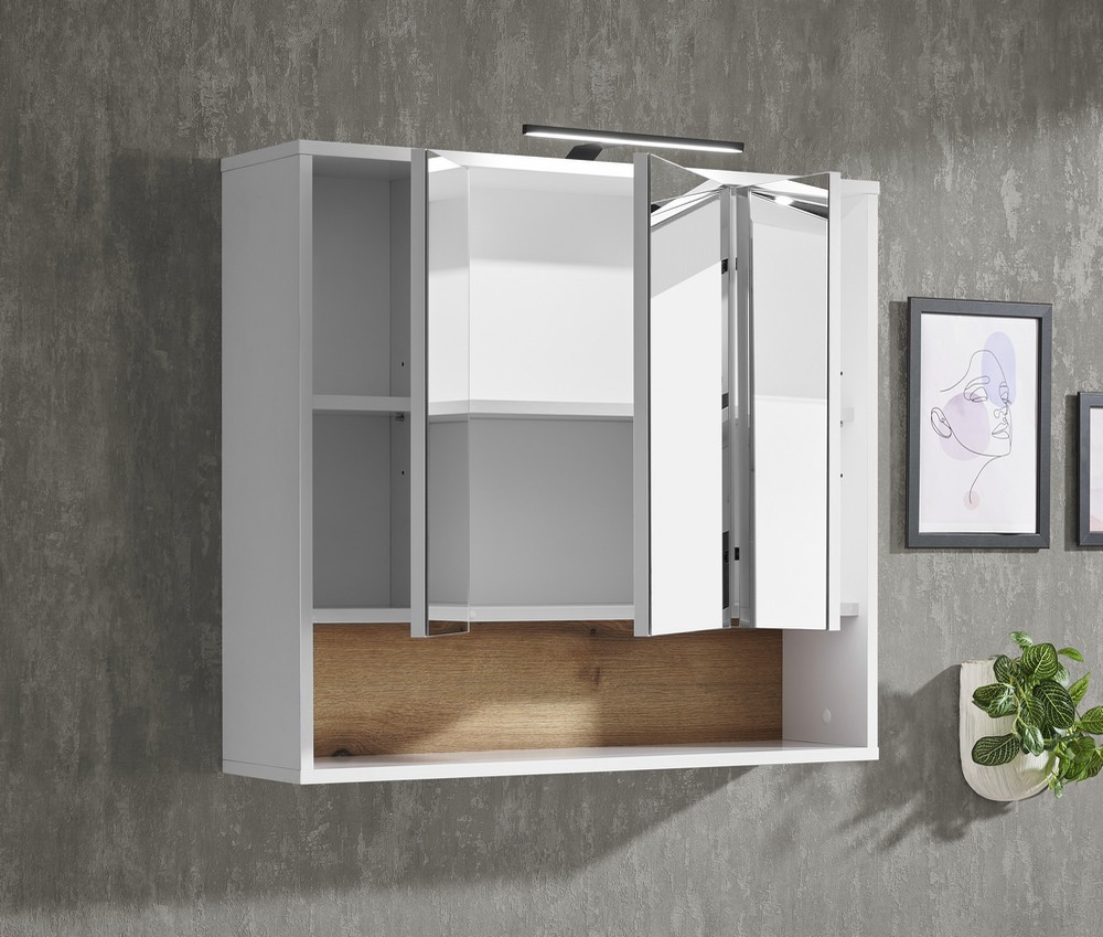 - Ausführung: Front Weiß/Absetzung Evoke Eiche Nachbildung, Korpus Weiß, inklusive Beleuchtung, 3 Spiegeltüren, 1 offenes Fach, BHT ca. 80x72x20cm