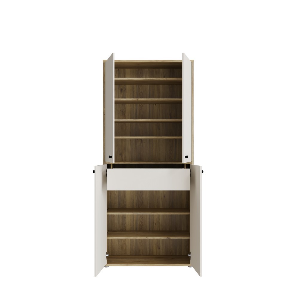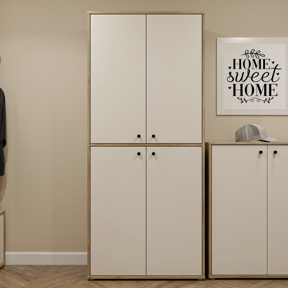 Schuhschrank Kendray mit Fronten in Sand Nachbildung und einem Korpus in Mauvella Eiche Nachbildung. Ausgestattet mit vier Türen und einem Schubkasten.