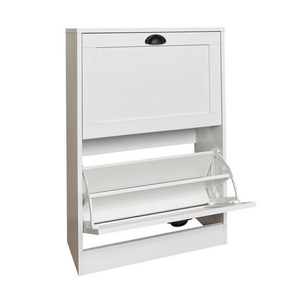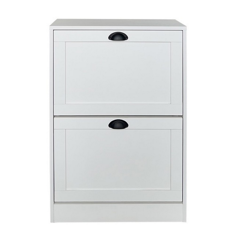 Die zwei praktischen Klappen mit je zwei Ebenen bieten großzügigen Stauraum für mehrere Paar Schuhe und sorgen gleichzeitig für Ordnung und eine übersichtliche Aufbewahrung. Dank der schlichten Optik in Weiß lässt sich der Schuhschrank perfekt in verschiedene Einrichtungsstile integrieren.