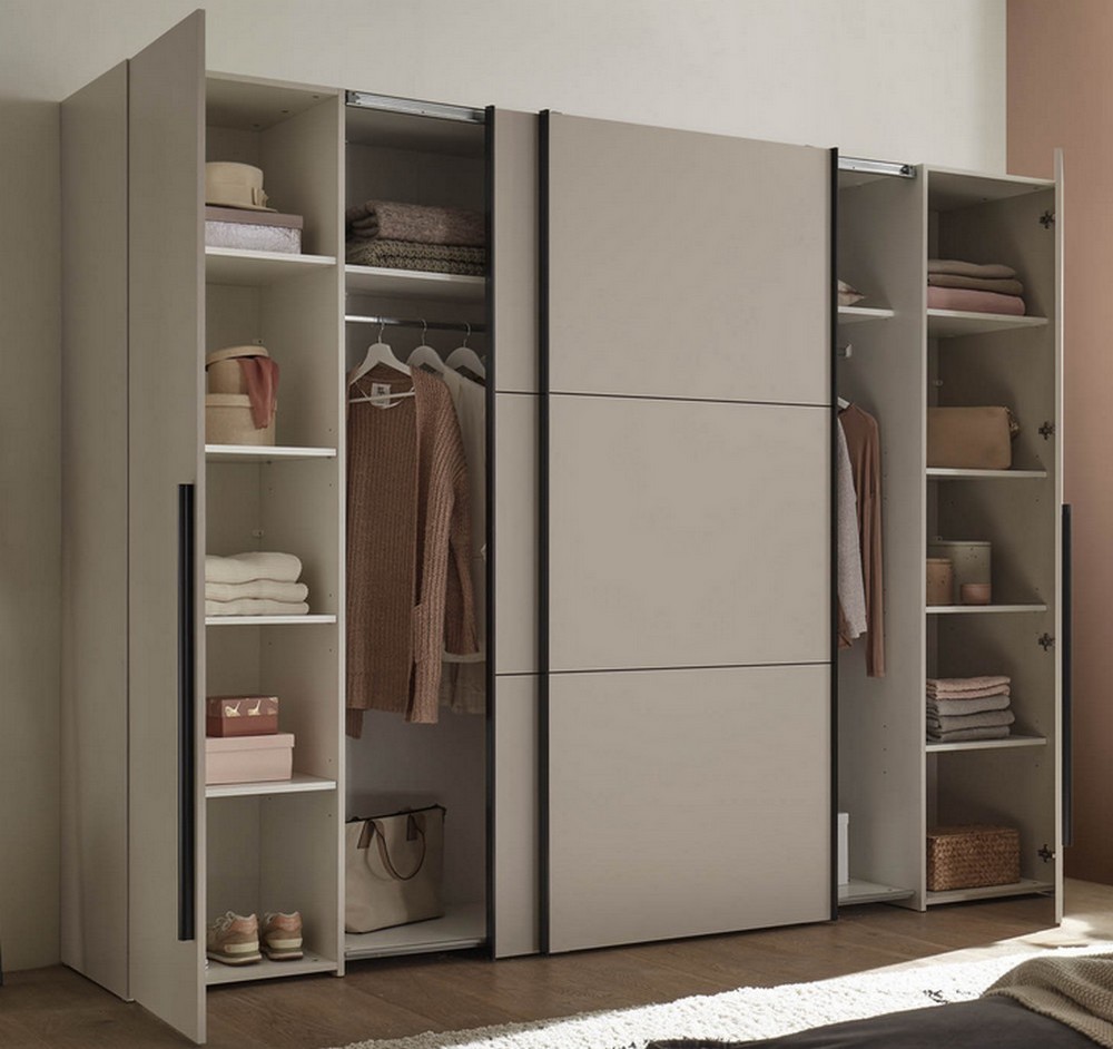 - Ausführung: Korpus/Front Dekorfolie, Farbe Kaschmir, 2 Schwebe-/ 2-Drehtüren (außen), Inneneinteilung: 3 Mittelseiten / links und rechts je 4 Böden / Mitte je 1 Boden und1 Kleiderstange, B/H/T 267x205x57 cm