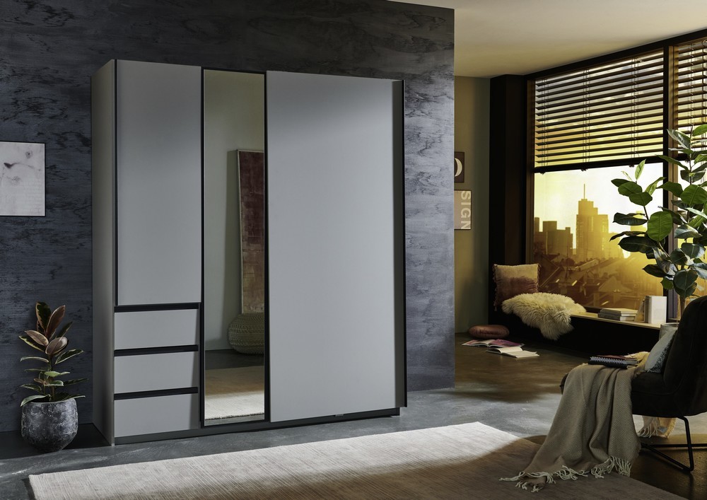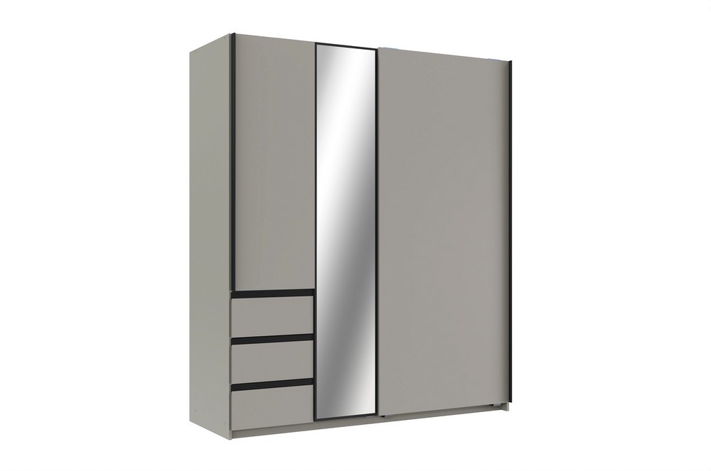 Moderner Schwebetürenschrank Stade in Saharagrau Nachbildung mit Absetzung in Graphit. Ausgestattet mit einem Spiegel und drei Schubkästen.