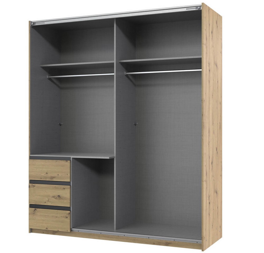 Moderner Schwebetürenschrank Stade in Artisan Eiche Nachbildung mit Absetzung in Graphit. Ausgestattet mit einem Spiegel und drei Schubkästen.