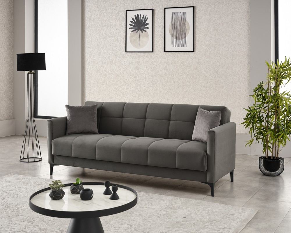 Funktionssofa Peru mit Stoffbezug Soft Grau, ausgestattet mit Bettfunktion und Bettkasten. In der Lieferung enthalten sind zwei Zierkissen.