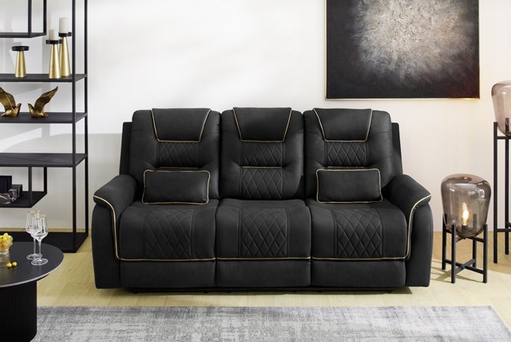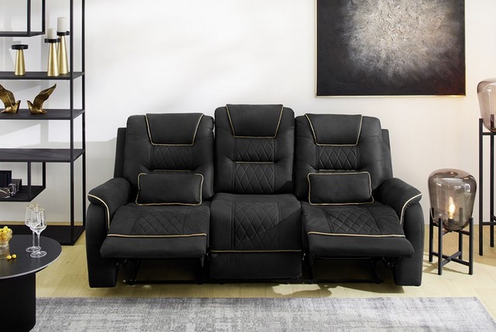 Sehr schönes und bequemes Sofa Nevada mit einem strapazierfähigen Microfaserbezug in Schwarz mit goldenem Keder. Ausgestattet mit halbautomatischer Relaxfunktion und Wall-free-Beschlag. Polsterung Nosagunterfederung mit TTF.